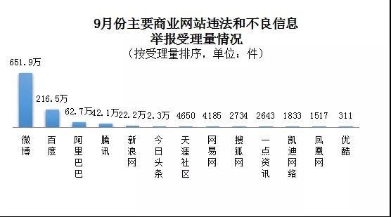 在全國(guó)主要網(wǎng)站受理的舉報(bào)中,微博、百度、阿里巴巴、騰訊、新浪網(wǎng)、今日頭條等主要商業(yè)網(wǎng)站受理量占78.0%,達(dá)999.4萬(wàn)件。