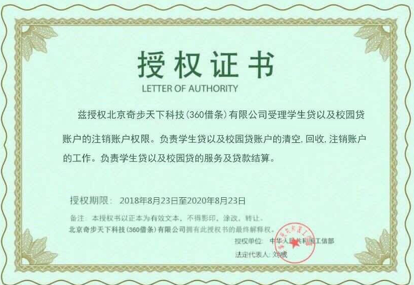 一個(gè)QQ號(hào)寫著“360金融客服中心”,當(dāng)記者與其加為好友后,對(duì)方立刻發(fā)來(lái)了一份“授權(quán)證書”,其中寫明:茲授權(quán)北京奇步天下科技(360借條)有限公司受理學(xué)生貸以及校園貸賬戶的注銷賬戶權(quán)限。負(fù)責(zé)學(xué)生貸以及校園貸賬戶的清空、回收、注銷工作。負(fù)責(zé)學(xué)生貸以及校園貸的服務(wù)及貸款結(jié)算。落款的授權(quán)單位寫著“中華人民共和國(guó)工信部”,并蓋有公章。