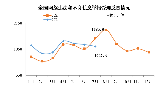 2022年7月,全國網(wǎng)信舉報工作部門、主要網(wǎng)站平臺受理舉報1441.4萬件,環(huán)比下降3.8%、同比下降14.5%。其中,中央網(wǎng)信辦(國家互聯(lián)網(wǎng)信息辦公室)違法和不良信息舉報中心受理舉報54.4萬件,環(huán)比增長18.9%、同比增長73.0%;各地網(wǎng)信舉報工作部門受理舉報77.3萬件,環(huán)比下降0.9%、同比下降31.8%;全國主要網(wǎng)站平臺受理舉報1309.7萬件,環(huán)比下降4.8%、同比下降15.0%。 在全國主要網(wǎng)站平臺受理的舉報中,主要商業(yè)網(wǎng)站平臺受理量占56.7%,達742.6萬件。 在各級網(wǎng)信舉報工作部門指導(dǎo)下,目前全國各主要網(wǎng)站平臺不斷暢通舉報渠道、受理處置網(wǎng)民舉報。歡迎廣大網(wǎng)民積極參與網(wǎng)絡(luò)綜合治理,共同維護清朗網(wǎng)絡(luò)空間。