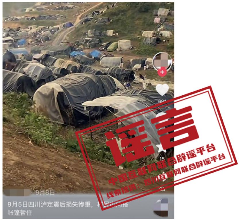 這類(lèi)謠言往往通過(guò)移花接木拼湊而成,有的冒用不相干的圖片或視頻企圖自證,有的依靠PS等拼接技術(shù)進(jìn)行偽造,還有的利用人工智能和大數(shù)據(jù)生成仿真音視頻信息。如“重慶嘉陵江被曬干了,兩名男子騎摩托車(chē)橫渡嘉陵江”“四川地震后村民在山腳下自搭帳篷居住”等謠言,均屬于用“移花接木”手法編撰的虛假信息:前者實(shí)為水位降低的自然情況,橫渡視頻的拍攝地點(diǎn)是長(zhǎng)江珊瑚壩而非嘉陵江;后者則是四川樂(lè)山筍農(nóng)打筍時(shí)臨時(shí)搭建的休息帳篷。此外,“浙江寧波北侖、慈溪被水淹”等視頻還采用特效合成手法制造謠言,著實(shí)居心不良。