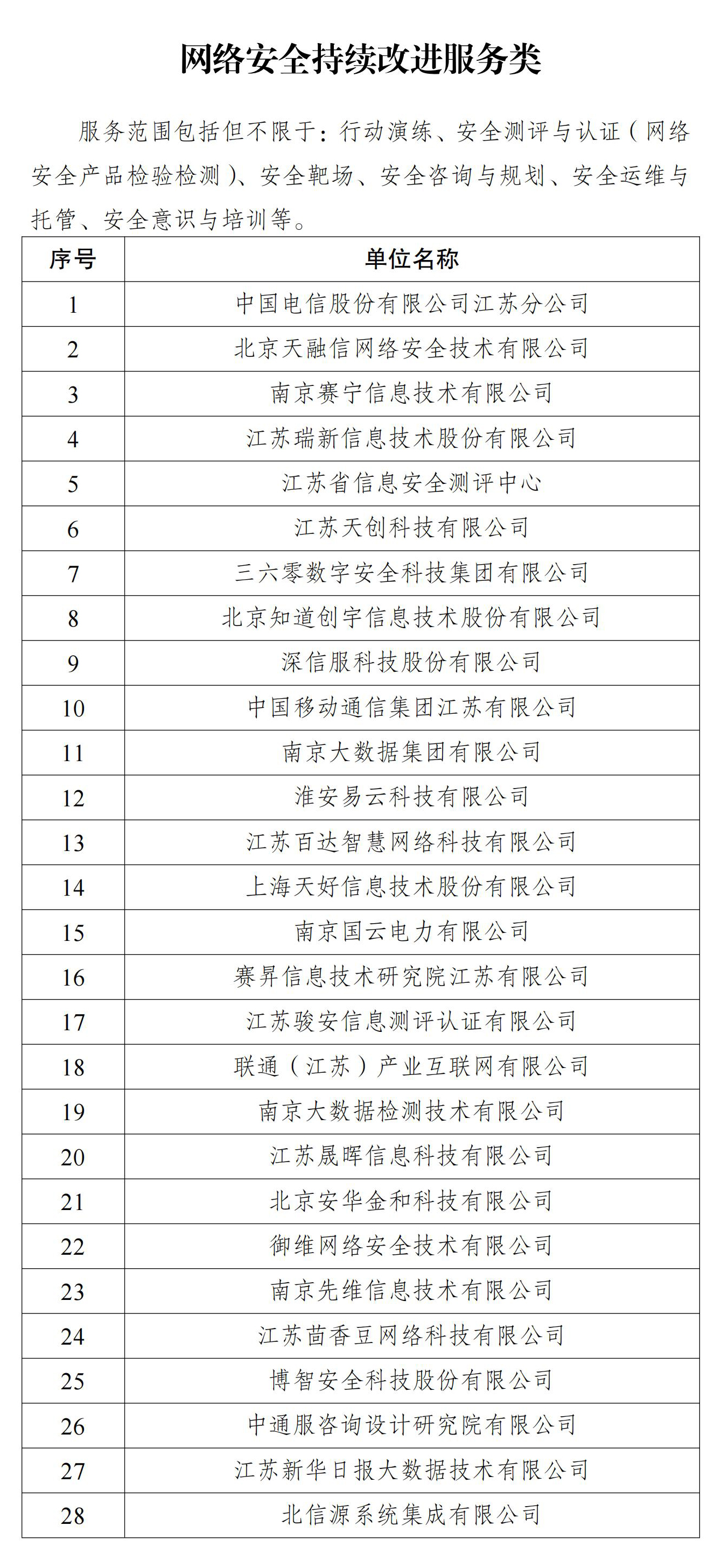 根據(jù)中共江蘇省委網(wǎng)絡(luò)安全和信息化委員會辦公室《關(guān)于開展2024年度江蘇省網(wǎng)絡(luò)安全服務(wù)資源池申報工作的通知》,經(jīng)自主申報、形式審查、專家評審和綜合評定等環(huán)節(jié),擬選取以下6類共54家單位進(jìn)入2024年度江蘇省網(wǎng)絡(luò)安全服務(wù)資源池。