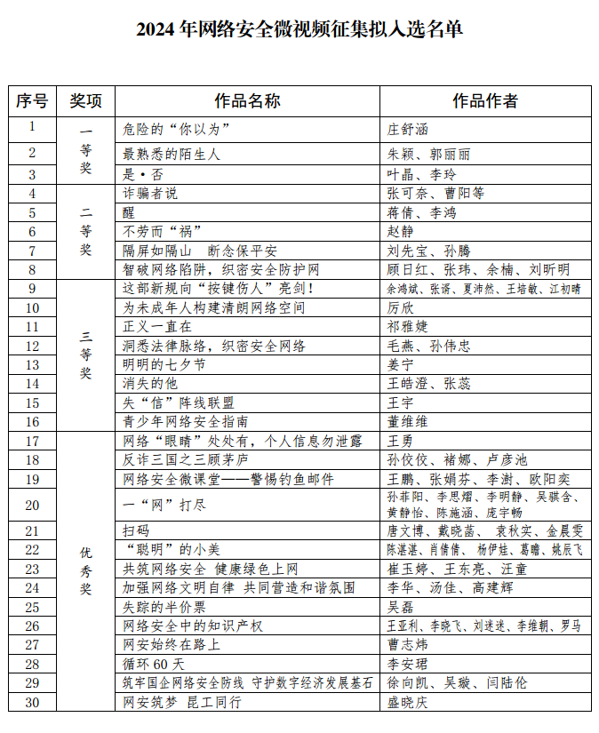 經(jīng)單位和個人申報、初篩審查、專家評審和內(nèi)容審核,評選出優(yōu)秀作品30件,其中一等獎3件、二等獎5件、三等獎8件、優(yōu)秀獎14件。下步,相關(guān)作品在2024江蘇省網(wǎng)絡(luò)安全宣傳周專欄發(fā)布。現(xiàn)將擬入選名單進行公示。