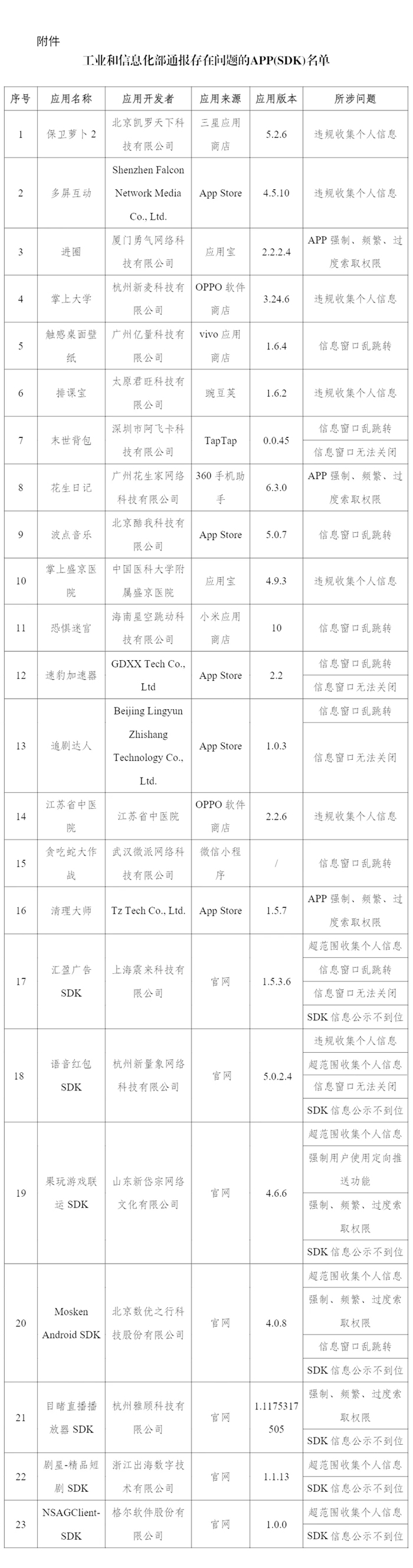 附件:工業(yè)和信息化部通報存在問題的APP(SDK)名單