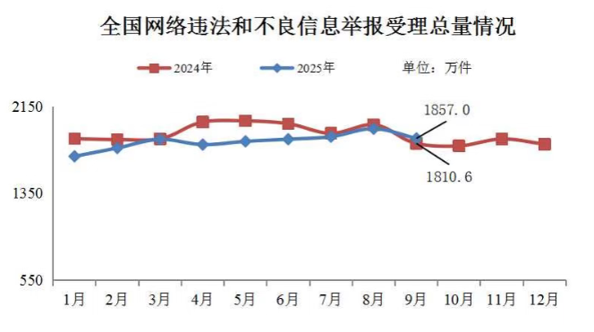 2025年9月,中央網(wǎng)信辦舉報中心指導(dǎo)全國各級網(wǎng)信舉報工作部門、主要網(wǎng)站平臺受理網(wǎng)民舉報色情、賭博、侵權(quán)、謠言等違法和不良信息1857萬件,環(huán)比下降4.6%、同比增長2.6%。其中,中央網(wǎng)信辦舉報中心受理舉報39.4萬件,環(huán)比下降7.4%、同比下降1.6%;各地網(wǎng)信舉報工作部門受理舉報100.8萬件,環(huán)比增長58.8%、同比下降9%;全國主要網(wǎng)站平臺受理舉報1716.8萬件,環(huán)比下降6.7%,同比增長3.4%。