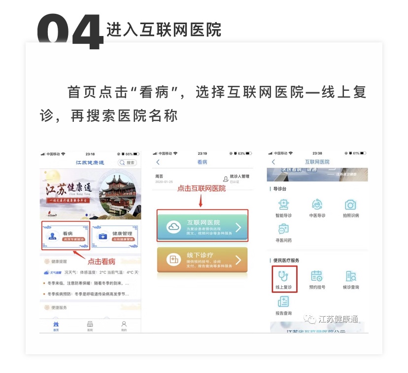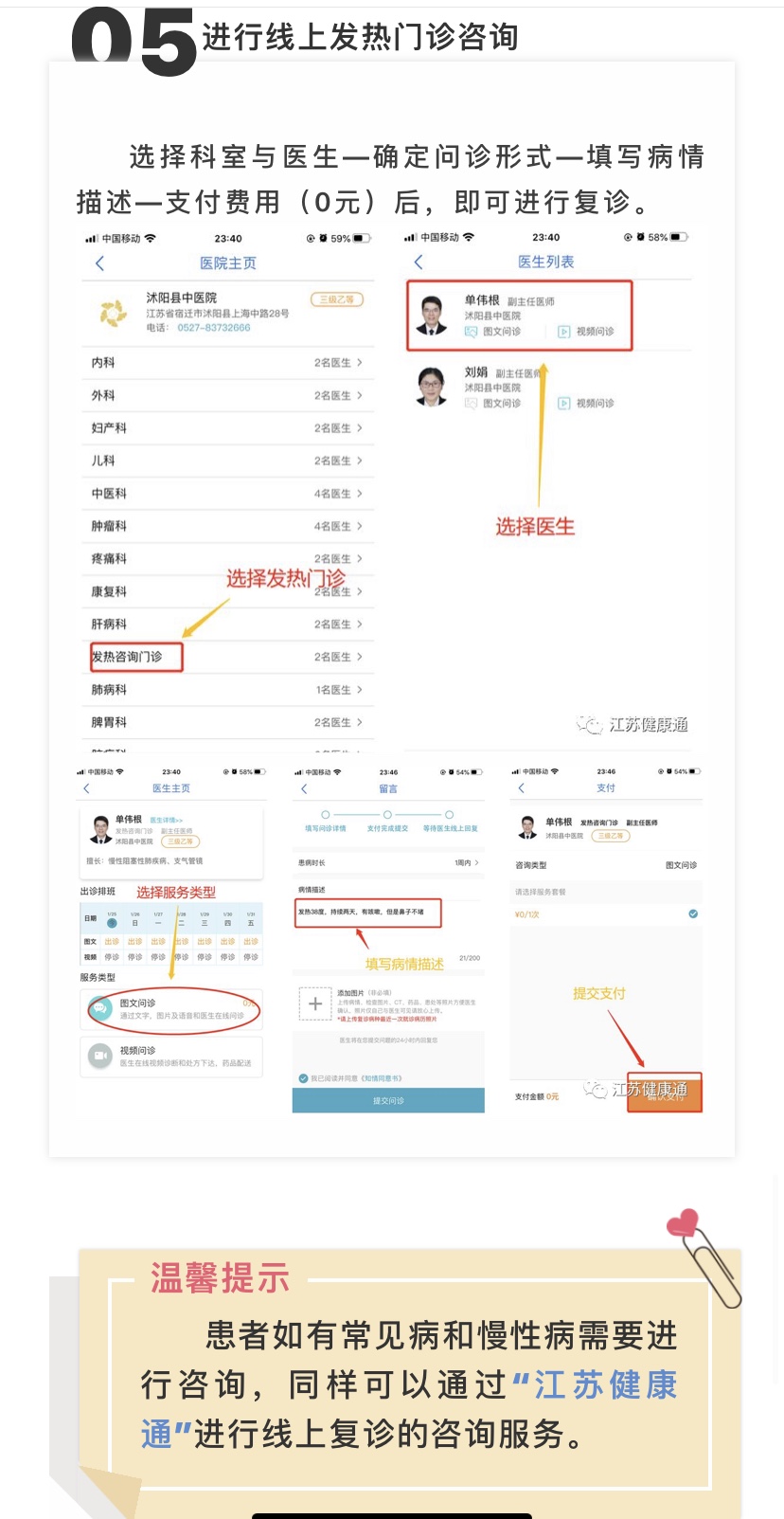 如果你有"發(fā)熱、咳嗽、全身無力"等癥狀,只需下載“江蘇健康通”APP,進(jìn)行實(shí)名注冊(cè)后,搜索相應(yīng)醫(yī)院,即可通過圖文問診或視頻問診的方式對(duì)醫(yī)生發(fā)起在線咨詢,享受與發(fā)熱門診同等的診療咨詢服務(wù),根據(jù)醫(yī)生的問診建議,再采取進(jìn)一步的應(yīng)對(duì)。