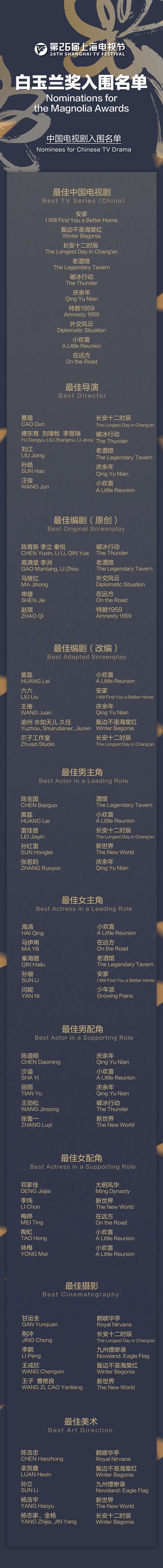 白玉蘭獎(jiǎng)入圍全名單公布同時(shí)公布。今年上海電視節(jié)順應(yīng)行業(yè)發(fā)展趨勢(shì),首次將“重點(diǎn)視頻網(wǎng)站首播電視劇”納入白玉蘭獎(jiǎng)評(píng)選。在中國(guó)電視劇入圍名單中,電視劇《小歡喜》獲7項(xiàng)提名稍占優(yōu)勢(shì)。最佳男、女主角,最佳男、女配角的競(jìng)爭(zhēng)也異常激烈。