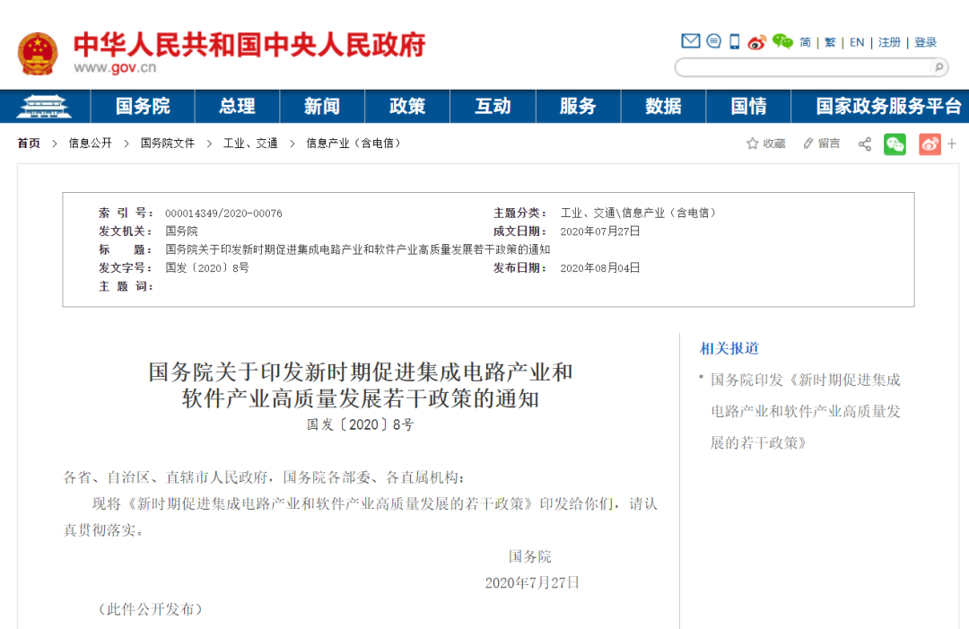 8月4日,國(guó)務(wù)院印發(fā)《新時(shí)期促進(jìn)集成電路產(chǎn)業(yè)和軟件產(chǎn)業(yè)高質(zhì)量發(fā)展的若干政策》(以下簡(jiǎn)稱《若干政策》),這份最新的政策大禮包被業(yè)內(nèi)稱為“8號(hào)文”。