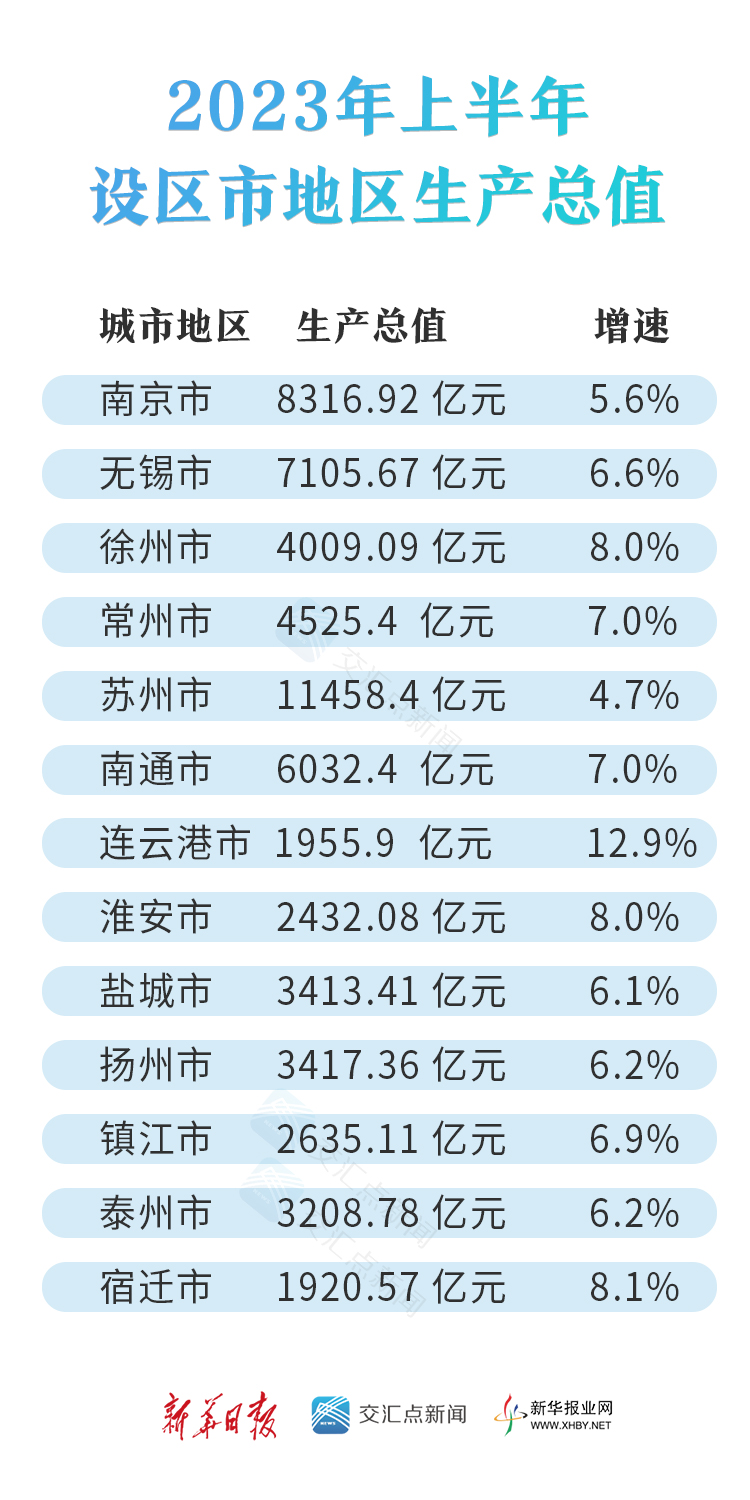 7月31日,隨著徐州市2023年上半年數(shù)據(jù)的發(fā)布,江蘇13個(gè)設(shè)區(qū)市的數(shù)據(jù)也全部出爐。具體來看,蘇州市地區(qū)生產(chǎn)總值 11458.4億元,南京市8316.92億元,無錫市7105.67億元,南通市6032.4億元,常州市4525.4億元,徐州市4009.09億元,揚(yáng)州市3417.36億元,鹽城市3413.41億元,泰州市3208.78億元,鎮(zhèn)江市2635.11億元,淮安市2432.08億元,連云港市1955.9億元,宿遷市1920.57億元。