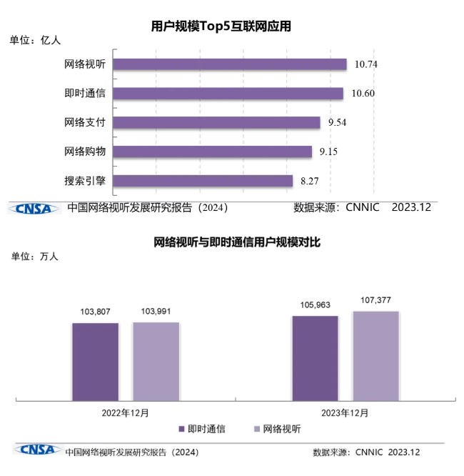 截至2023年12月,我國網(wǎng)絡(luò)視聽用戶規(guī)模達(dá)10.74億,網(wǎng)民使用率為98.3%。值得注意的是,網(wǎng)絡(luò)視聽用戶規(guī)模與排在第二的即時(shí)通信之間的差距進(jìn)一步拉大,領(lǐng)先優(yōu)勢從2022年的184萬人提升到2023年的1414萬人。