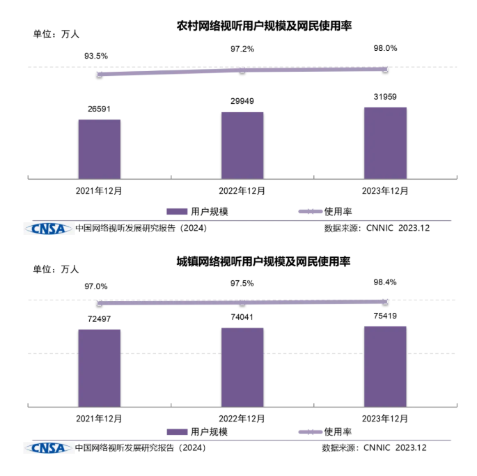 兩年來,網(wǎng)絡(luò)視聽用戶增量主要來自農(nóng)村,網(wǎng)絡(luò)視聽在推進(jìn)鄉(xiāng)村振興戰(zhàn)略走好“最后一公里”中扮演重要角色、貢獻(xiàn)重要力量。2022年、2023年,我國農(nóng)村網(wǎng)絡(luò)視聽用戶規(guī)模分別為2.99億人、3.20億人,同比分別增長12.6%、6.8%,增速遠(yuǎn)高于同期城鎮(zhèn)用戶(2.1%、1.9%)。