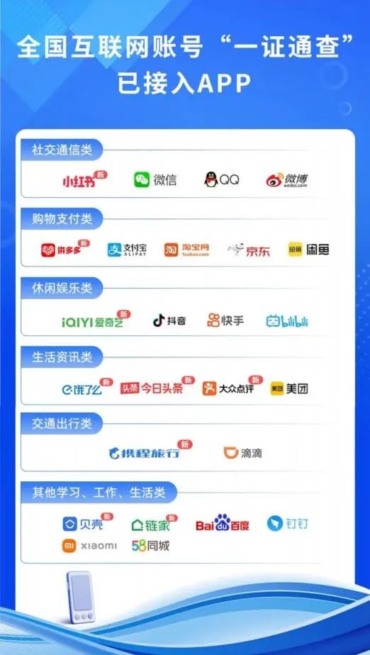 據(jù)工業(yè)和信息化部消息,自12月1日起,“一證通查”查詢名下互聯(lián)網賬號服務新增接入今日頭條、攜程旅行、拼多多、餓了么、愛奇藝、小紅書、大眾點評、貝殼找房、鏈家等9款互聯(lián)網App,用戶本人名下手機號碼關聯(lián)互聯(lián)網賬號的可查范圍擴增至25款。