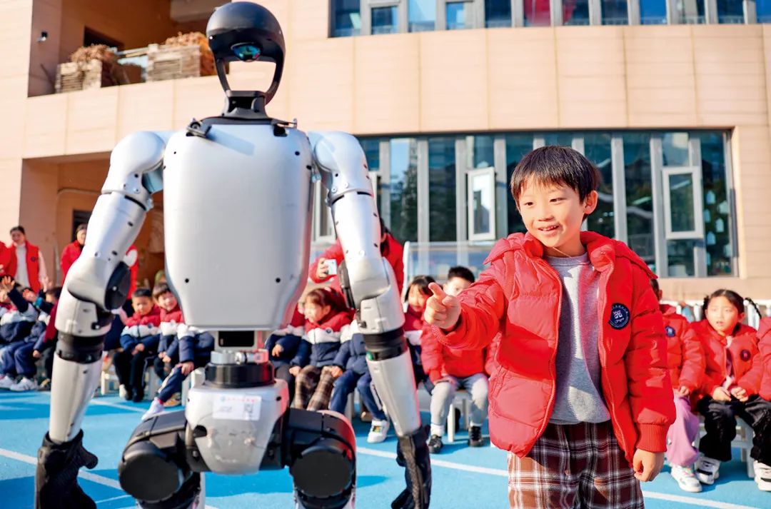 浙江省寧波市江北區(qū)甬港幼兒園的孩子們?cè)诳破栈顒?dòng)現(xiàn)場(chǎng)近距離觀察人形機(jī)器人(2025年1月2日攝)江漢攝