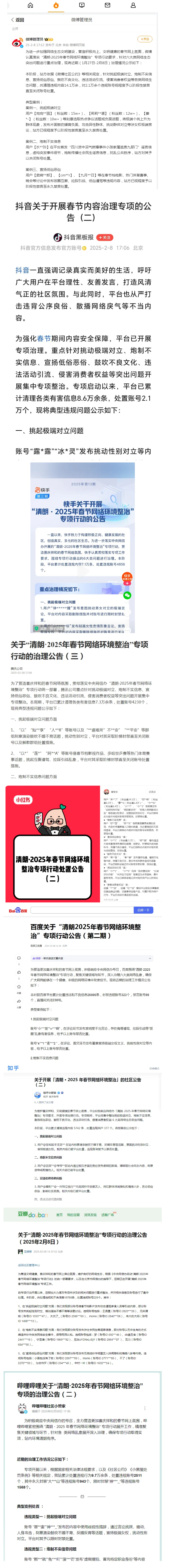 “清朗·2025年春節(jié)網絡環(huán)境整治”專項行動啟動以來,網信部門迅速部署、狠抓落實,強化排查處置,抓好督導整改,督促重點網站平臺切實履行主體責任,針對挑起極端對立、炮制不實信息、宣揚低俗惡俗、鼓吹不良文化、違法活動引流、侵害消費者權益等6類問題,從嚴查處一批違法違規(guī)典型案例,確保整治工作取得扎實成效,為營造春節(jié)良好網絡氛圍提供了有力保障。截至目前,微博、抖音、快手、騰訊、小紅書、百度、知乎、豆瓣、嗶哩嗶哩等重點平臺累計清理違法違規(guī)信息103萬余條,處置賬號9.7萬個。