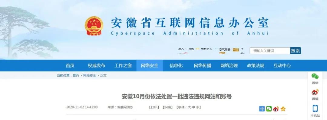 2020年10月,安徽各級網(wǎng)信系統(tǒng)深入推進“江淮凈網(wǎng)·清朗2020”“自媒體基礎管理專項整治”等專項行動,持續(xù)加大違法違規(guī)網(wǎng)站賬號處置力度,會同省通信管理局,依法依規(guī)查處25家違法違規(guī)網(wǎng)站,約談網(wǎng)站賬號運營者18人次,協(xié)調(diào)有關平臺依照用戶服務協(xié)議關閉違法違規(guī)微信公眾號8個,論壇賬號131個,清理違法和不良信息3157條。