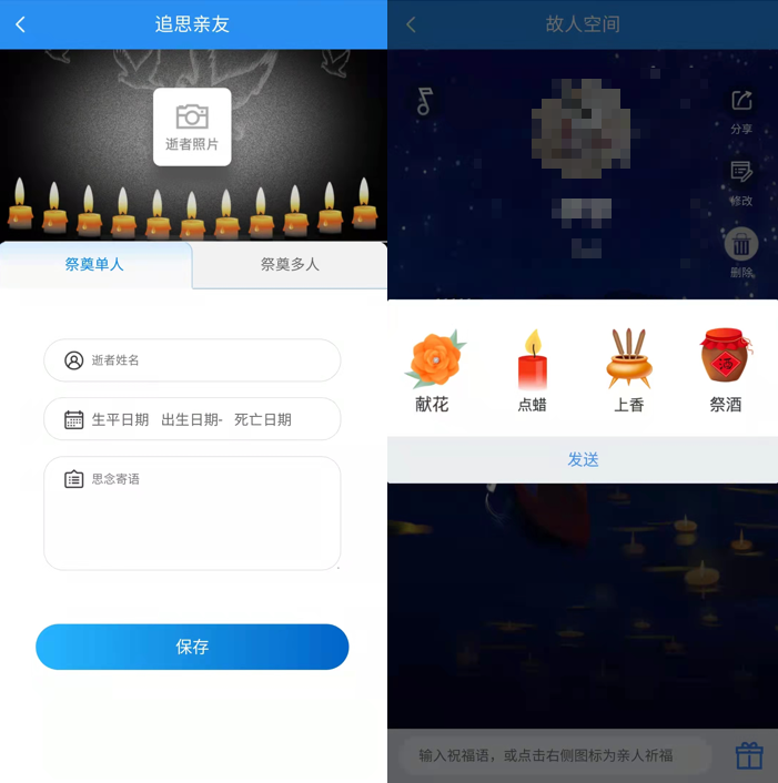 3、在“追思親友”頁面可以選擇祭奠單人或者祭奠多人,輸入相關(guān)信息后進入“故人空間”,可以通過獻花、點蠟、上香和祭酒等方式來表達心意、寄托哀思。