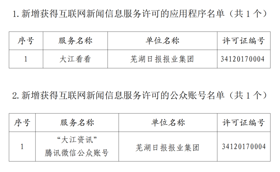 近日,安徽省互聯(lián)網(wǎng)信息辦公室按照《互聯(lián)網(wǎng)新聞信息服務(wù)管理規(guī)定》和國家網(wǎng)信辦有關(guān)工作要求,批準(zhǔn)蕪湖日?qǐng)?bào)報(bào)業(yè)集團(tuán)的2個(gè)項(xiàng)目從事互聯(lián)網(wǎng)新聞信息服務(wù),包括互聯(lián)網(wǎng)移動(dòng)應(yīng)用程序“大江看看”、騰訊微信公眾賬號(hào)“大江資訊”。