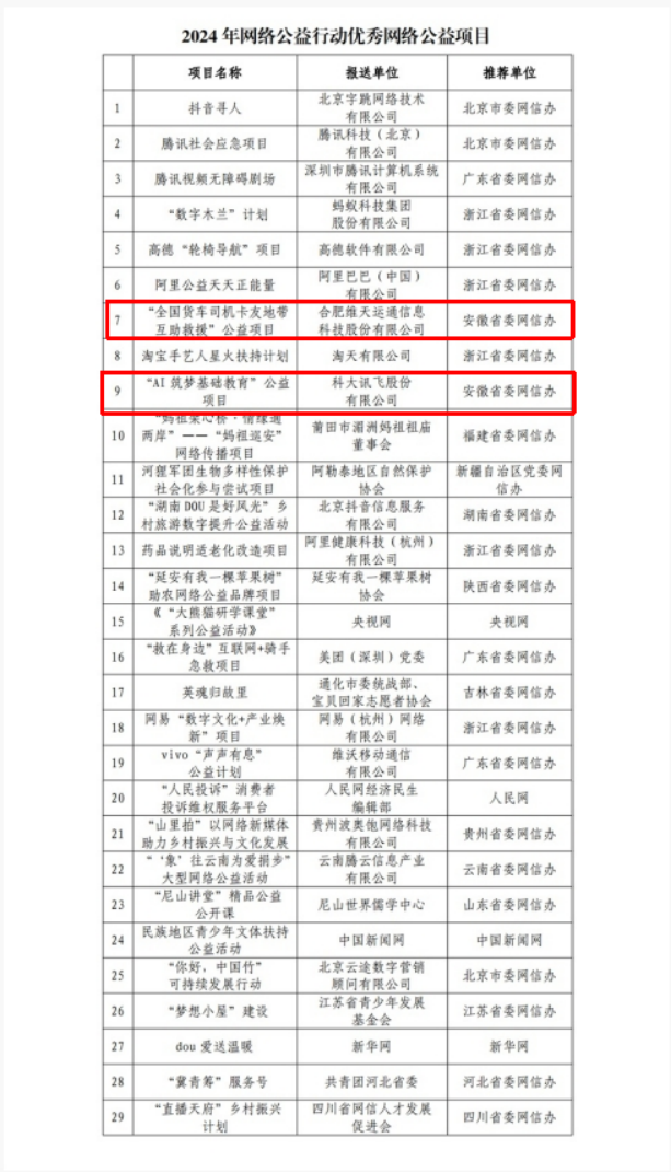 近日,在成都舉行的中國網(wǎng)絡(luò)文明大會,發(fā)布了2024年網(wǎng)絡(luò)公益行動(dòng)優(yōu)秀網(wǎng)絡(luò)公益項(xiàng)目29個(gè)典型案例,由安徽省委網(wǎng)信辦報(bào)送的“全國貨車司機(jī)卡友地帶互助救援”和“AI筑夢基礎(chǔ)教育”網(wǎng)絡(luò)公益項(xiàng)目成功入選。