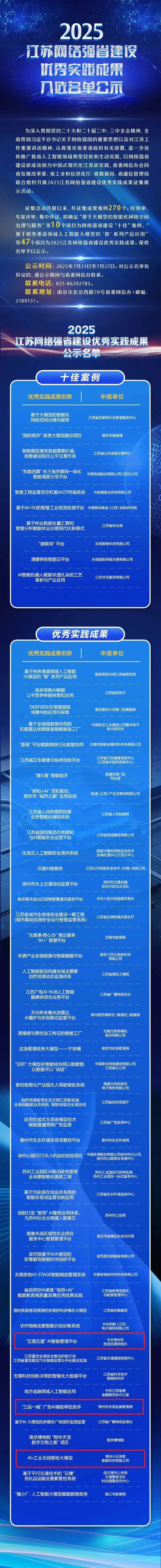 近日由省委網(wǎng)信辦會同省發(fā)展改革委、省工業(yè)和信息化廳、省數(shù)據(jù)局、省通信管理局聯(lián)合組織開展的2025江蘇網(wǎng)絡(luò)強(qiáng)省建設(shè)優(yōu)秀實踐成果入選名單正式公示