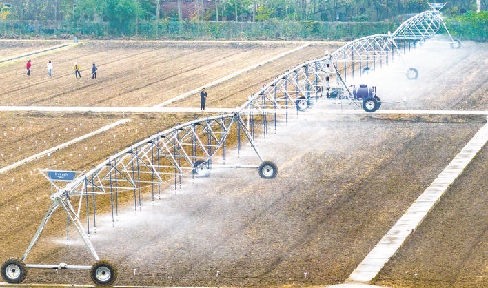 連日來,江蘇省白馬湖農(nóng)場(chǎng)搶抓農(nóng)時(shí)播種小麥,利用智慧農(nóng)機(jī)開展田間噴灌作業(yè),提高種植效率。圖為昨日,該農(nóng)場(chǎng)利用平行行走式水肥藥一體機(jī)噴灌麥田。