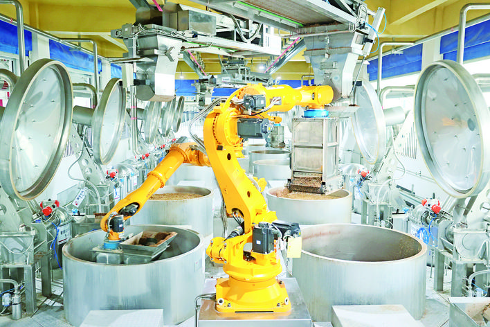近年來,我市立足市場需求,夯實(shí)工業(yè)基礎(chǔ),持續(xù)開展“5G+工業(yè)互聯(lián)網(wǎng)”數(shù)字化車間、智能生產(chǎn)線、智慧工廠建設(shè),推動(dòng)制造業(yè)數(shù)字化、智能化,實(shí)現(xiàn)高質(zhì)量發(fā)展。圖為近日,在江蘇今世緣酒業(yè)股份有限公司智能化釀酒車間,機(jī)械手臂在精準(zhǔn)投料。