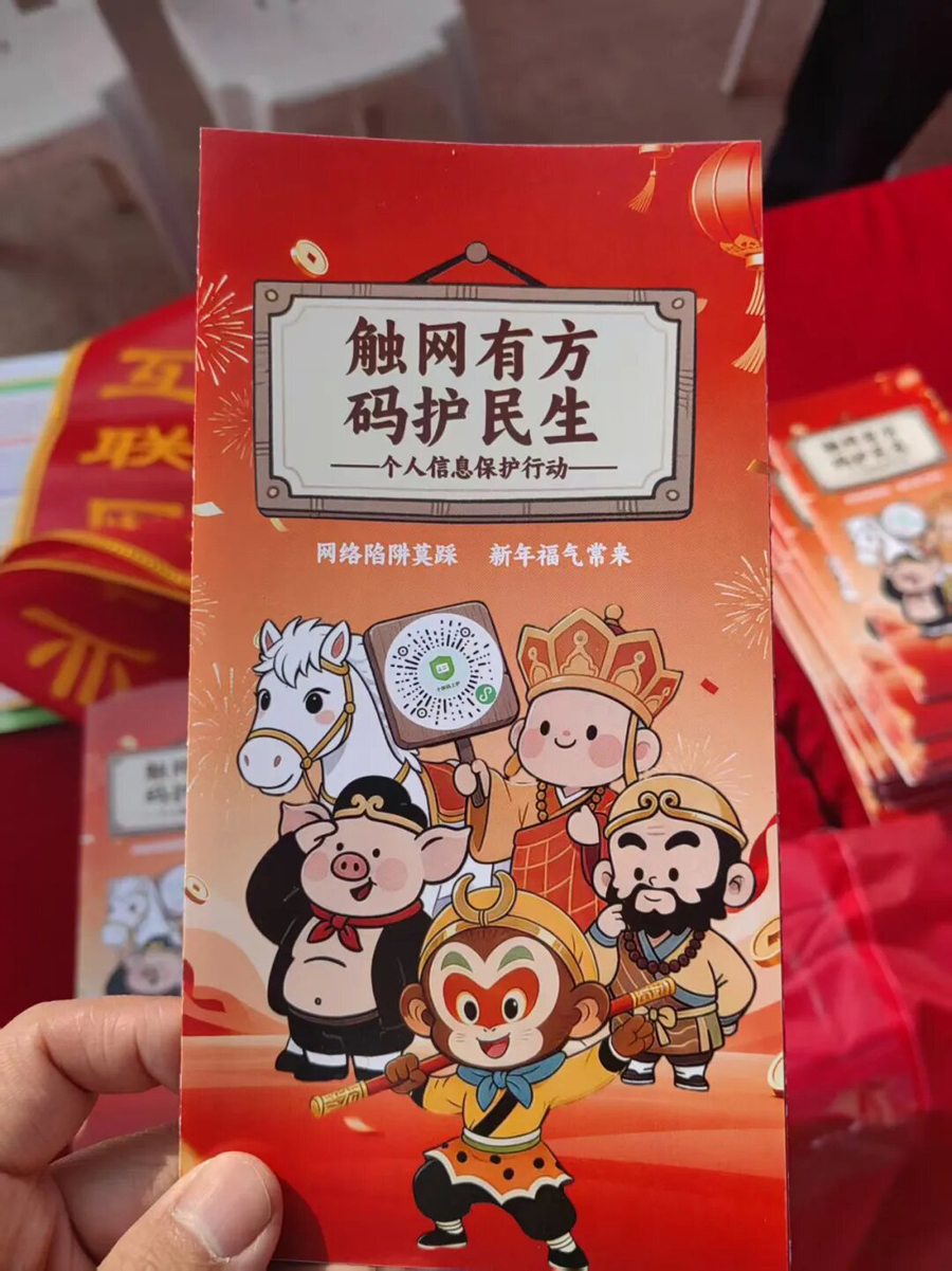 在“網(wǎng)絡(luò)普法咨詢臺”攤位,普法志愿者遞來一本《西游新記》漫畫折頁。“媽媽快看,是孫悟空的故事!”孩子立刻被畫風(fēng)吸引,安靜地看了起來?!段饔涡掠洝穫€人信息保護(hù)系列漫畫折頁由淮安市委網(wǎng)信辦、淮安市新聞傳媒中心聯(lián)合推出,聚焦未成年人個人信息保護(hù)的熱點話題,通過生動有趣的漫畫故事,幫助未成年人提升網(wǎng)絡(luò)素養(yǎng),增強(qiáng)個人信息保護(hù)意識?!队露锋I盤妖》《小仙女遇險記》《火云洞反詐記》《取經(jīng)路上的“星”陷阱》……每期一個小故事,設(shè)計融入“西游網(wǎng)絡(luò)普法IP”卡通形象,巧妙地將《中華人民共和國個人信息保護(hù)法》《中華人民共和國網(wǎng)絡(luò)安全法》《中華人民共和國未成年人保護(hù)法》法律條文融入生動的西游故事,通俗易懂、貼近農(nóng)村生活。