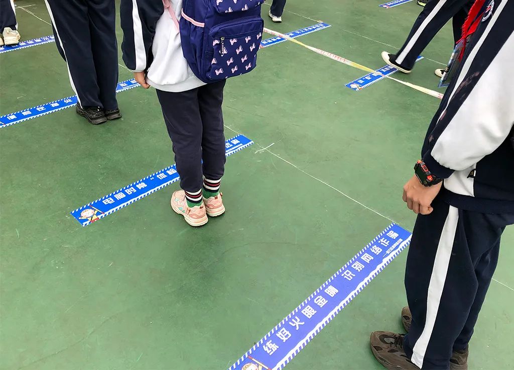 5月12日,在連云港市墟溝小學(xué)教育集團(tuán)操場(chǎng)上的核酸檢測(cè)采樣點(diǎn),同學(xué)們一邊排隊(duì)一邊小聲讀著“一米線”上的內(nèi)容。學(xué)校核酸檢測(cè)的“一米線”印上了這些網(wǎng)絡(luò)普法內(nèi)容的小貼士,變成了疫情防控與網(wǎng)絡(luò)文明結(jié)合的小小宣傳欄。