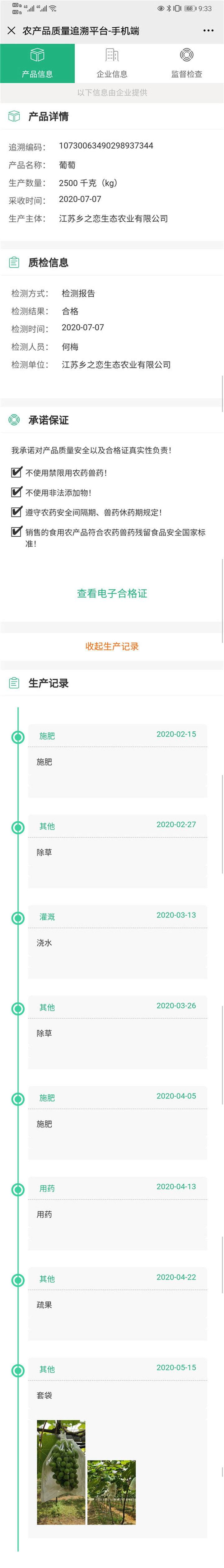 吳亮亮口中的合格證就是一個二維碼,通過掃描這個二維碼,顧客可以了解農(nóng)產(chǎn)品從種到摘的所有信息。記者掃描剛剛生成的二維碼,上面顯示了產(chǎn)品的施肥時間、除草時間、用藥記錄以及農(nóng)藥殘留檢測報告、承諾等。