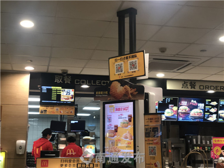 7日下午,記者來到南通市區(qū)中南城商圈,首先走進(jìn)一家麥當(dāng)勞。柜臺前、餐桌上,到處都貼著二維碼,并提示“掃一掃 點(diǎn)餐不排隊(duì)”。當(dāng)記者詢問店員,想用現(xiàn)金支付、是否可以人工點(diǎn)單時(shí),店員引導(dǎo)記者來到一旁的自助點(diǎn)餐機(jī)前,告知可以在屏幕上點(diǎn)選需要的商品。選好后,店員幫忙操作打印出一張單子,隨后又帶記者到前臺付款找零,并提醒小票上有取餐碼,請留意叫號。整個(gè)過程還是比較順利的,相比手機(jī)自助點(diǎn)單,多花的一兩分鐘主要是在收銀環(huán)節(jié)。