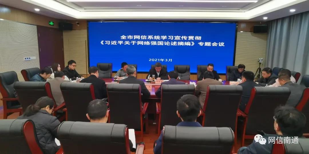 3月3日,南通市委網(wǎng)信辦召開(kāi)專題學(xué)習(xí)會(huì)議,組織全市網(wǎng)信系統(tǒng)集中學(xué)習(xí)《習(xí)近平關(guān)于網(wǎng)絡(luò)強(qiáng)國(guó)論述摘編》,并對(duì)網(wǎng)信系統(tǒng)學(xué)習(xí)宣傳貫徹《習(xí)近平關(guān)于網(wǎng)絡(luò)強(qiáng)國(guó)論述摘編》作出工作部署。