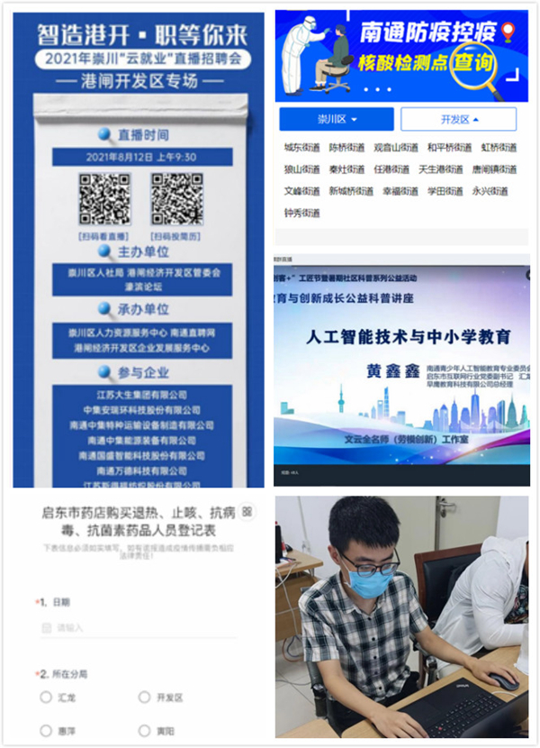 在號召全民新冠疫苗接種的重要階段,啟東市互聯(lián)網(wǎng)行業(yè)黨委副書記、鑫業(yè)網(wǎng)絡(luò)負(fù)責(zé)人帶領(lǐng)黨員技術(shù)骨干積極研究開發(fā)未打疫苗人員的網(wǎng)絡(luò)登記系統(tǒng),制作藥物采購線上登記系統(tǒng),為疫情防控提供技術(shù)支持,同時(shí)還開放網(wǎng)上免費(fèi)課程,幫助廣大學(xué)生在線充電。在崇川,濠濱網(wǎng)與政府職能部門開展云就業(yè)直播招聘會(huì),制作南通防疫防控核酸檢測點(diǎn)網(wǎng)上查詢系統(tǒng),為廣大居民提供便利。江蘇智慧安全可信技術(shù)研究院獲悉南通六院需要核酸檢測支援,立刻派出黨員骨干前往醫(yī)院配合防疫,積極提供數(shù)字技術(shù)支撐。