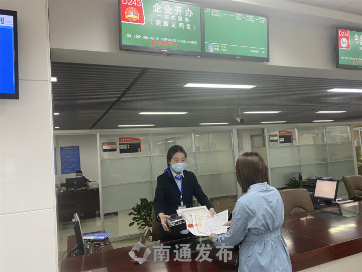 前幾天,遠在江西的徐國慶,拿到了開設(shè)在南通公司的營業(yè)執(zhí)照,“我只準(zhǔn)備了一張身份證,在網(wǎng)上就完成了企業(yè)新設(shè),順便完成了公司社保、稅務(wù)、公積金以及銀行開戶,還免費得到了一套企業(yè)公章。”