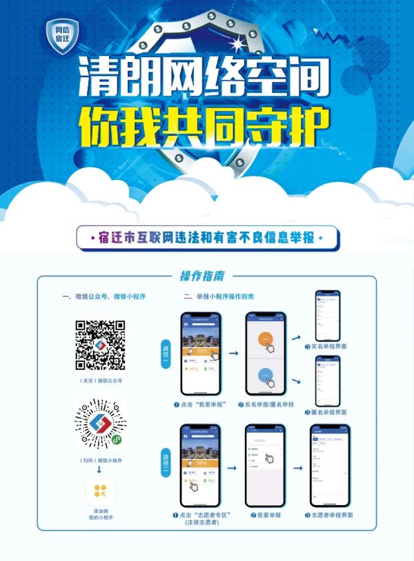 渠道二:“宿遷市互聯(lián)網(wǎng)違法和有害不良信息舉報(bào)”專用小程序。(舉報(bào)小程序功能齊全,設(shè)有“我要舉報(bào)”“舉報(bào)指南”“志愿者專區(qū)”“法律法規(guī)”“機(jī)構(gòu)簡介”等版塊,隨時(shí)隨地一鍵掃描,便捷安裝輕松舉報(bào)。)