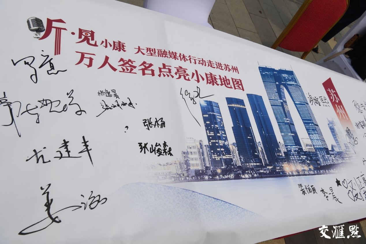 當(dāng)天,嘉賓和市民也紛紛在一幅30米“小康長(zhǎng)卷”上簽名,留下小康心愿,為“萬(wàn)人簽名·點(diǎn)亮小康地圖”活動(dòng)助力。這張寄托美好心愿的長(zhǎng)卷,跟隨“聽(tīng)·見(jiàn)小康”大型融媒體行動(dòng),從首場(chǎng)線下活動(dòng)舉辦地南京來(lái)到了“人間天堂”蘇州。隨著該活動(dòng)在江蘇十三市的陸續(xù)推進(jìn),“小康簽名長(zhǎng)卷”還將走遍江蘇大地。本次活動(dòng)還設(shè)置了互動(dòng)體驗(yàn)區(qū),包括“小康幸福車”“小康留聲機(jī)”“小康照相館”“小康打印機(jī)”“小康笑臉墻”等區(qū)域,引來(lái)眾多市民“打卡”參與,用“小康留聲機(jī)”訴說(shuō)心聲,在“小康照相館”記錄笑臉,參與者還領(lǐng)取了內(nèi)含自己小康笑臉的“‘聽(tīng)·見(jiàn)小康’特刊”作為活動(dòng)留念。