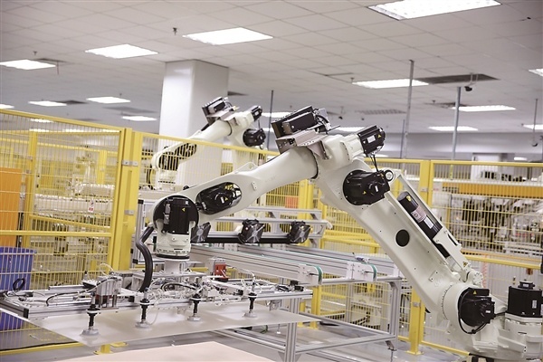 只要將訂單相關(guān)數(shù)據(jù)輸入生產(chǎn)集成系統(tǒng),幾秒鐘后,一個(gè)涵蓋使用原料、工藝等元素的生產(chǎn)計(jì)劃便可出爐。進(jìn)入生產(chǎn)環(huán)節(jié)后,訂單便流轉(zhuǎn)到無人的“熄燈工廠”?!跋艄S”內(nèi),只見機(jī)械臂不停地重復(fù)抓取、翻轉(zhuǎn)、移動等動作,自動導(dǎo)引運(yùn)輸車接收著系統(tǒng)自動向其下達(dá)的指令,來回運(yùn)送著貨物,無需任何人工操作。