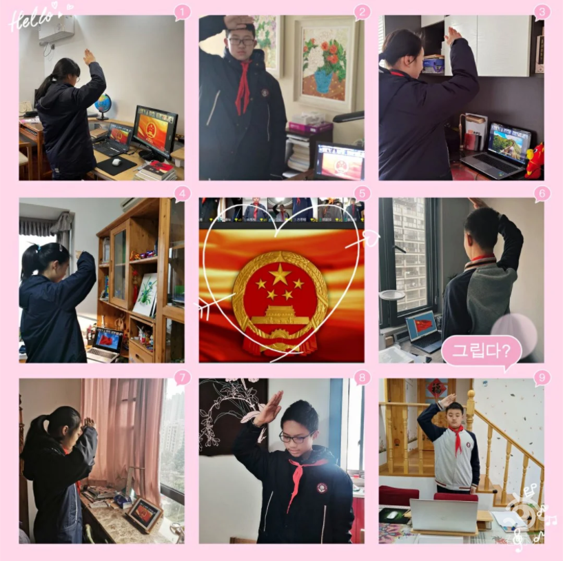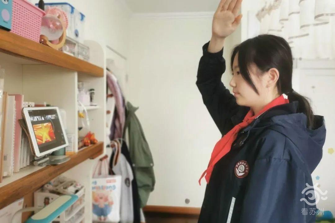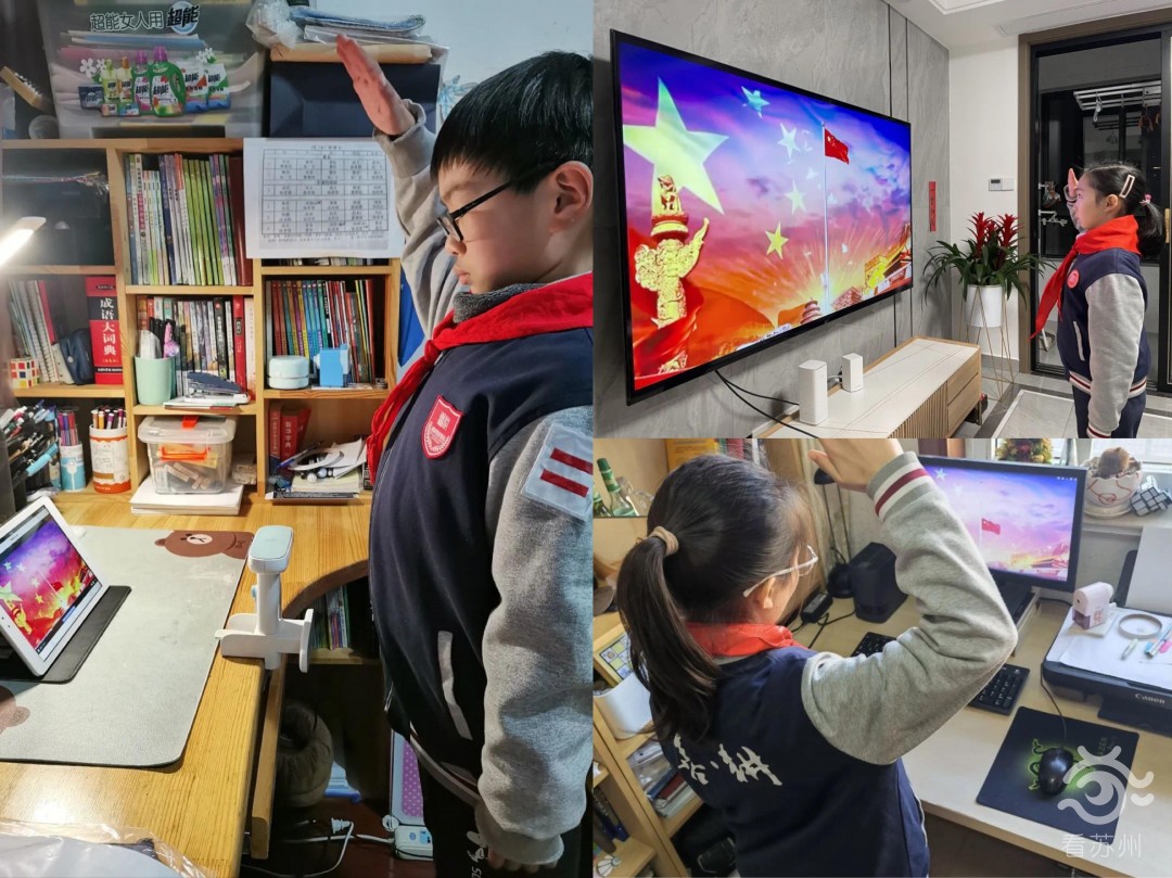2月28日早上,因?yàn)橐咔?,蘇州學(xué)子們通過電腦、手機(jī)、電視投屏等方式同步參與了線上升旗儀式。
