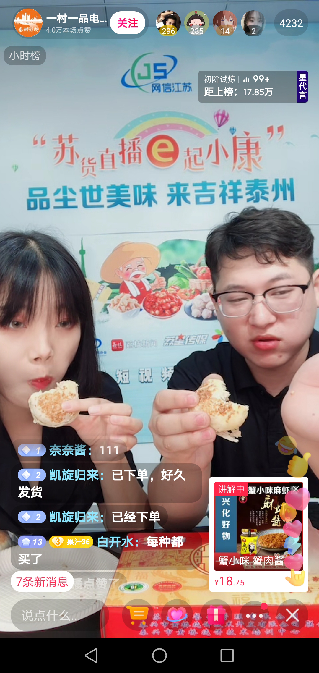 貝花子、爬強(qiáng)頭、蟹小咪等6個(gè)品牌系列,大麥若葉青汁豆奶、黃橋燒餅、河豚餃子、麻蝦醬、檸檬鳳爪、溱湖魚圓、麻辣小龍蝦尾、酵素豆奶等近30個(gè)特色產(chǎn)品輪番登場亮相。帶貨主播現(xiàn)場開吃,品嘗泰州美食好口味,與在線觀眾交流口感味道。專屬折扣令人心動(dòng),網(wǎng)民在線留言形成刷屏,沒想到泰州有那么多綠優(yōu)產(chǎn)品,不少外地網(wǎng)民用實(shí)際行動(dòng)”“打CALL”,通過直播中的二維碼進(jìn)行下單搶購。