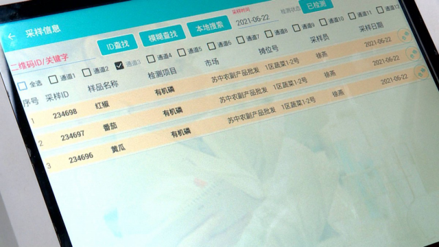 過完秤后,蘇中批發(fā)市場采樣員過來取樣,封裝貼簽,將趙衛(wèi)當(dāng)天所進(jìn)蔬菜的部分樣本送到市場待檢區(qū),檢測員隨后對樣品進(jìn)行監(jiān)測。來進(jìn)貨的商販只要到趙衛(wèi)攤位前掃描二維碼,就能看到蔬菜的庫存以及檢測結(jié)果,該結(jié)果也會同步公示到各個智慧農(nóng)貿(mào)市場的大屏上。