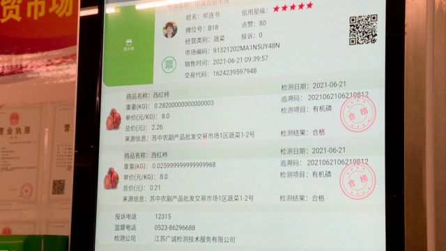 記者在市區(qū)各大智慧農(nóng)貿(mào)市場公示屏上看到,商戶信息、信用等級以及售賣商品的相關(guān)檢測情況一應(yīng)俱全,除此之外,市民在農(nóng)貿(mào)市場任何一個攤位購買農(nóng)產(chǎn)品后,溯源電子秤打印出來的小票上會有一個二維碼,市民掃描二維碼就能溯源所購農(nóng)產(chǎn)品交易信息及檢測結(jié)果。