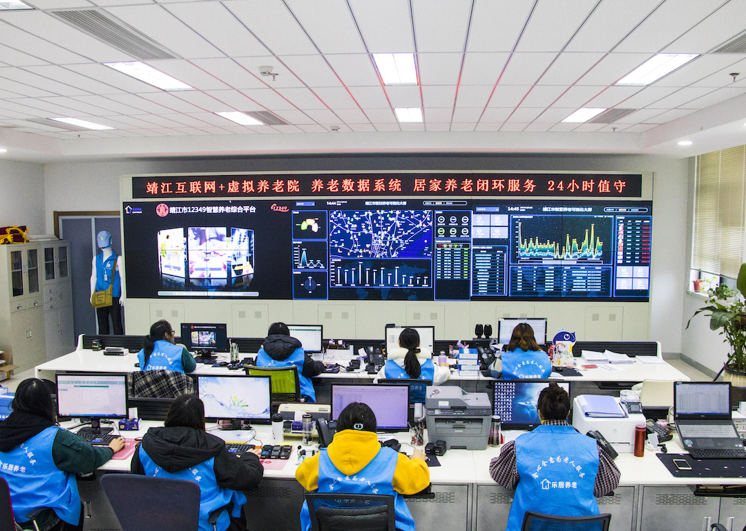 “歡迎撥打12349為老服務(wù)熱線?!薄昂玫模襾砺?lián)系附近的助老員,請稍等?!薄K省靖江市智慧養(yǎng)老服務(wù)平臺內(nèi),工作人員正忙著聯(lián)系調(diào)度,電子屏數(shù)據(jù)不斷跳動更新著,代表著活躍在城鄉(xiāng)各處的助老員正在服務(wù)中。