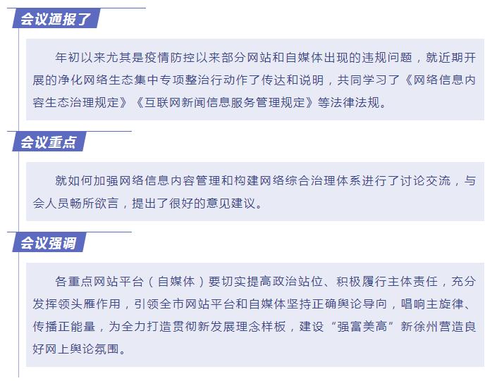 為深入貫徹落實(shí)《網(wǎng)絡(luò)信息內(nèi)容生態(tài)治理規(guī)定》,進(jìn)一步規(guī)范和引導(dǎo)屬地網(wǎng)站平臺(tái)和自媒體行業(yè)健康發(fā)展,根據(jù)中央和省市委關(guān)于推進(jìn)網(wǎng)絡(luò)綜合治理體系建設(shè)的部署要求,徐州市委網(wǎng)信辦于9月1日組織召開全市重點(diǎn)網(wǎng)站平臺(tái)(自媒體)座談會(huì),彭城教育網(wǎng)、大漢網(wǎng)、愛徐州、徐州黑板報(bào)等重點(diǎn)網(wǎng)站平臺(tái)和自媒體負(fù)責(zé)人共20余人參會(huì)。