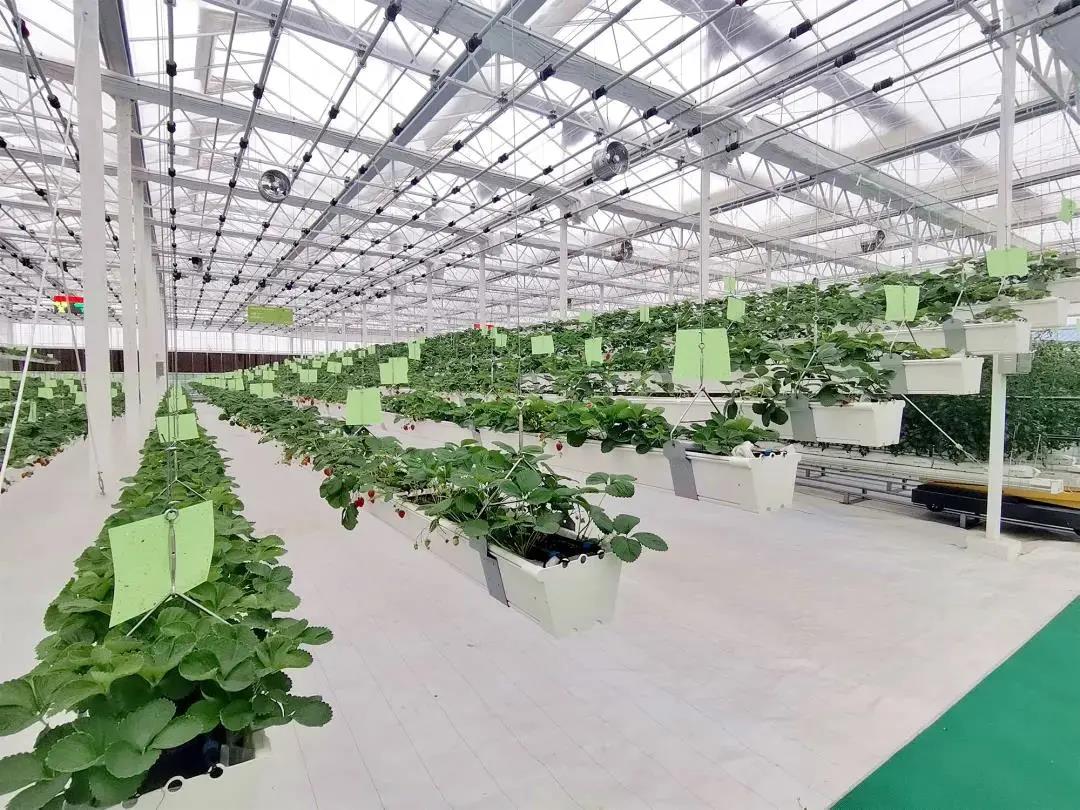 這個(gè)“高大上”的智能玻璃溫室占地2800平方米,分為育苗、章姬草莓種植、圣女果種植三個(gè)區(qū)域。