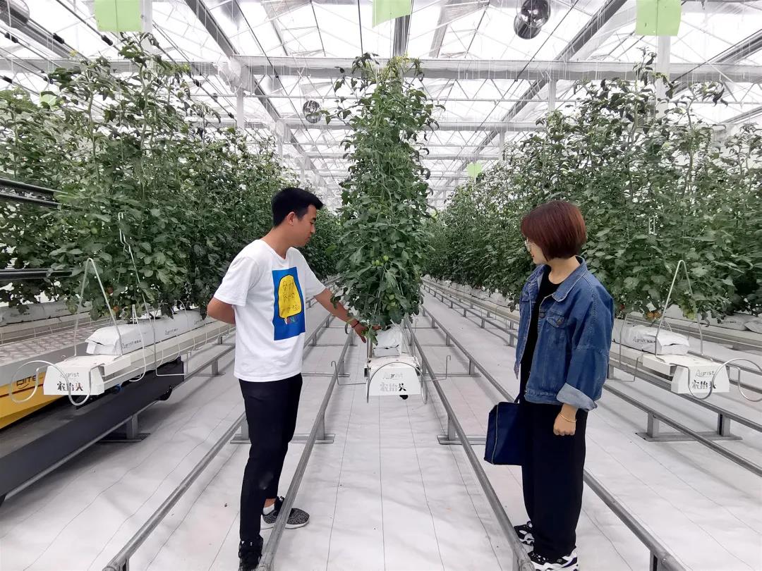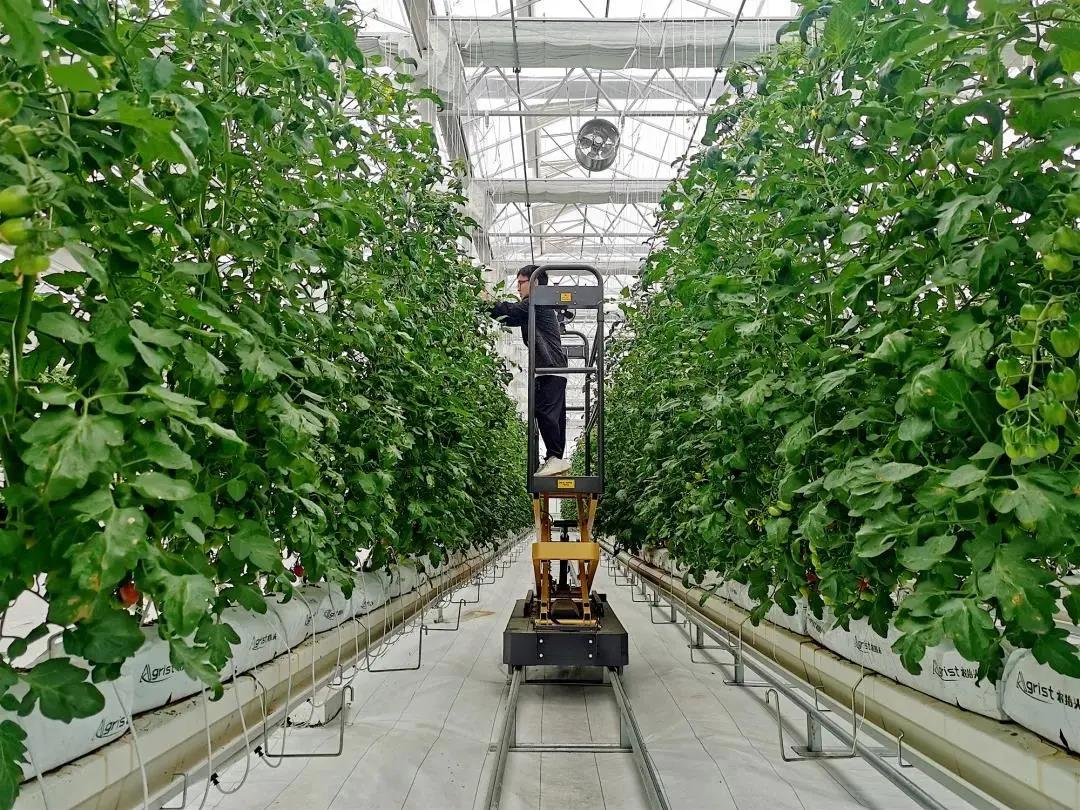 右側(cè)的“蔬菜工廠”里,載著工作人員的可移動(dòng)高空作業(yè)車來回穿梭,忙著給半空中的圣女果整枝。