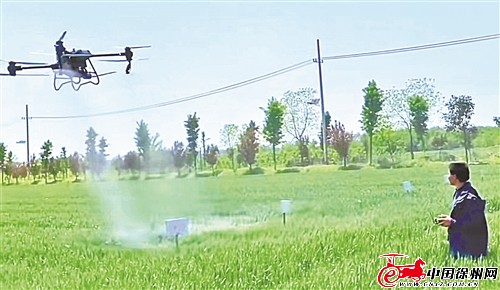 “5、4、3、2、1,起飛!”在新沂時集鎮(zhèn)白石村的麥田里,伴隨著螺旋槳的嗡鳴聲,一臺無人機在技術(shù)人員的操作下載著農(nóng)藥穩(wěn)穩(wěn)起飛,在麥田上空平穩(wěn)飛行,均勻地噴灑農(nóng)藥。風兒吹過,一株株小麥隨風起舞,涌起陣陣麥浪,展現(xiàn)出一幅生機盎然、豐收在望的美好圖景。