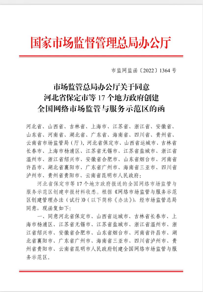 《市場(chǎng)監(jiān)管總局辦公廳關(guān)于同意河北省保定市等17個(gè)地方政府創(chuàng)建全國(guó)網(wǎng)絡(luò)市場(chǎng)監(jiān)管與服務(wù)示范區(qū)的函》中明確,根據(jù)《網(wǎng)絡(luò)市場(chǎng)監(jiān)管與服務(wù)示范區(qū)創(chuàng)建管理辦法(試行)》(以下簡(jiǎn)稱《辦法》),同意河北省保定市、山西省運(yùn)城市、吉林省長(zhǎng)春市、上海市楊浦區(qū)、江蘇省無(wú)錫市、江蘇省鹽城市、浙江省溫州市、浙江省紹興市、安徽省合肥市、山東省煙臺(tái)市、河南省許昌市、湖北省襄陽(yáng)市、廣東省廣州市、海南省三亞市、四川省瀘州市、貴州省貴陽(yáng)市、云南省昆明市人民政府創(chuàng)建全國(guó)網(wǎng)絡(luò)市場(chǎng)監(jiān)管與服務(wù)示范區(qū)。
