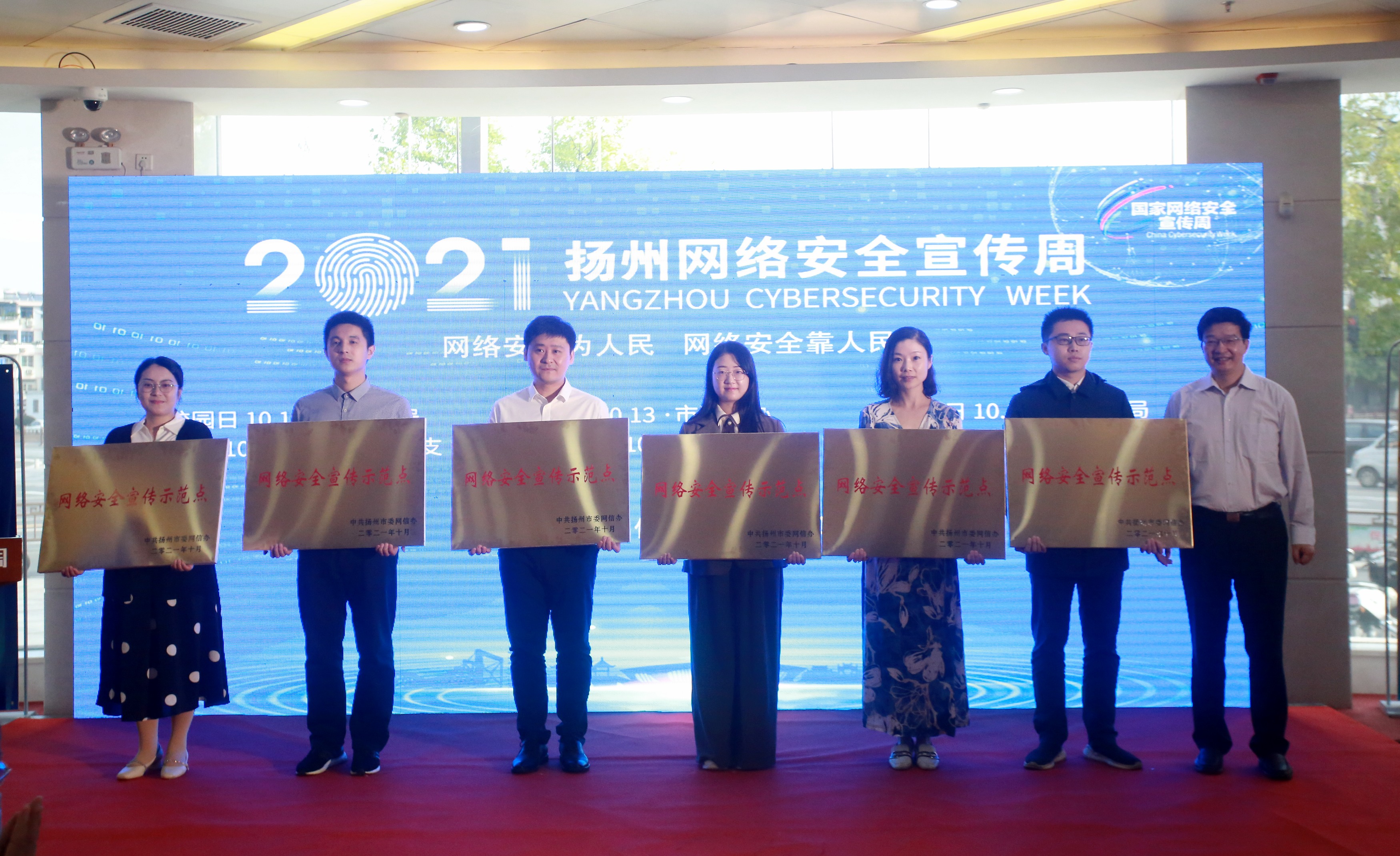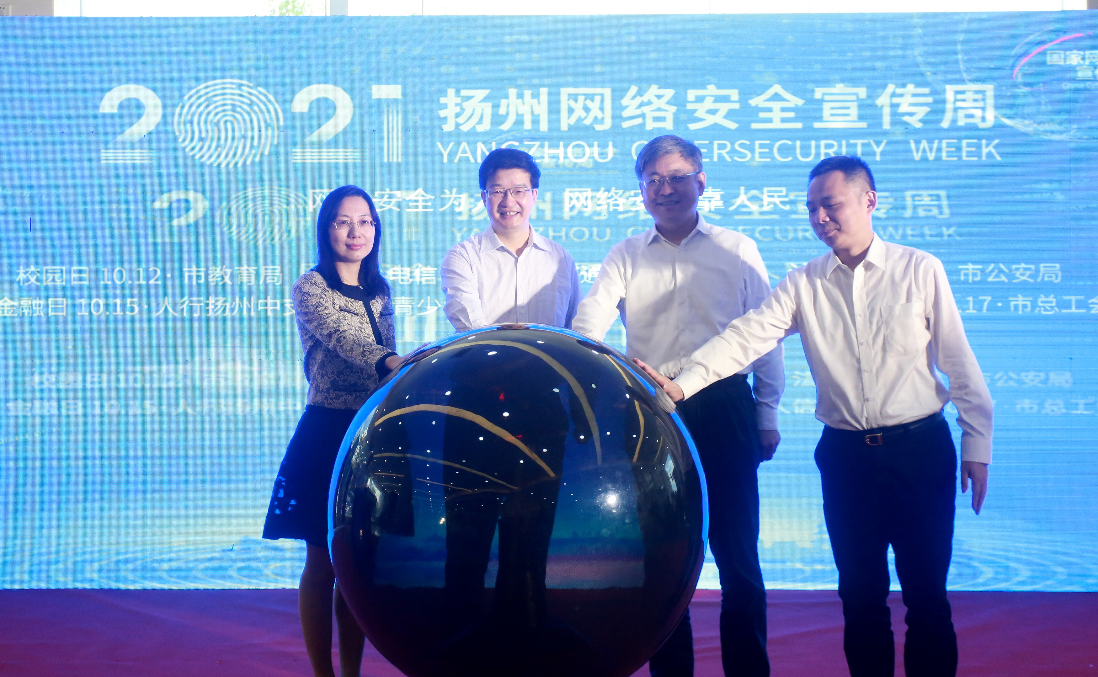 開幕式上,余珽副市長為揚州工行營業(yè)部、焦巷村、蔣王社區(qū)、花都匯互聯(lián)網(wǎng)公園、一束光城市書房、公交巴士等6家網(wǎng)絡(luò)安全宣傳示范點授牌。人民銀行揚州中心支行行長何敏代表主題日承辦單位發(fā)言。余珽、殷元松、何敏、市工商銀行行長蘇偉共同啟動2021年揚州網(wǎng)絡(luò)安全宣傳周。