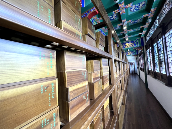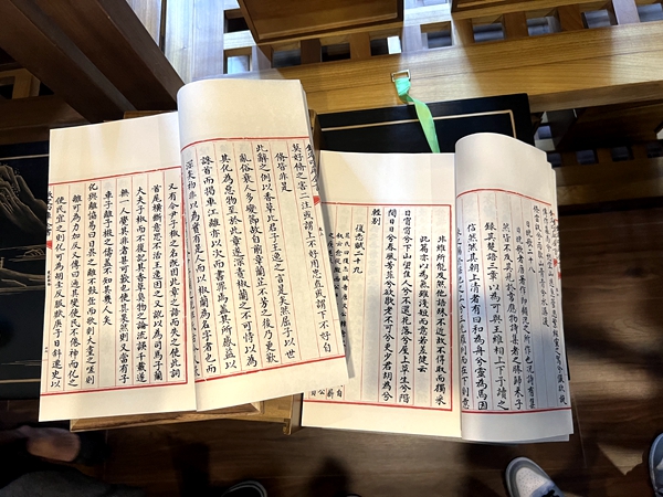 走進(jìn)文匯閣,一樓大廳正中,擺放了一張抄書桌,當(dāng)年讀書人可以在此借書、抄書。步入二、三樓,充滿歷史厚重感、碼放整齊由金絲楠木包裝好的《四庫全書》便印入記者眼簾。據(jù)了解,這部《四庫全書》是2013年由商務(wù)印書館榮譽(yù)出版、揚(yáng)州國書文化公司策劃制作的原樣、原大、原色《四庫全書》復(fù)制本。根據(jù)《四庫全書》文津閣藏本拍攝、重印、線裝的特藏本,按原樣收錄古書3470種,計(jì)79016卷、36078冊,與原書大小、顏色、紙質(zhì)、裝幀相同,封面仍是絹帛五色:經(jīng)部綠色、史部紅色、子部月白色、集部灰黑色、總目黃色。書籍與書函、書架配套,共計(jì)木函6144個(gè)、書架128個(gè)。文匯閣管理部經(jīng)理邵媛介紹:“這部書雖然是復(fù)制品,但書中字體也是館閣體,采用了筒子頁的裝幀方式,大小、顏色、樣貌等都和古書一模一樣?!?/p>