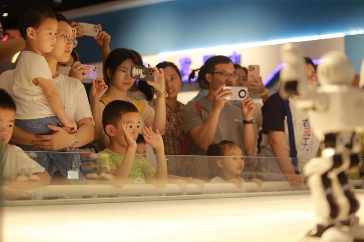 ①小朋友和家長在揚州科技館內(nèi)觀看機器人跳舞。新華社發(fā)(孟德龍 攝)