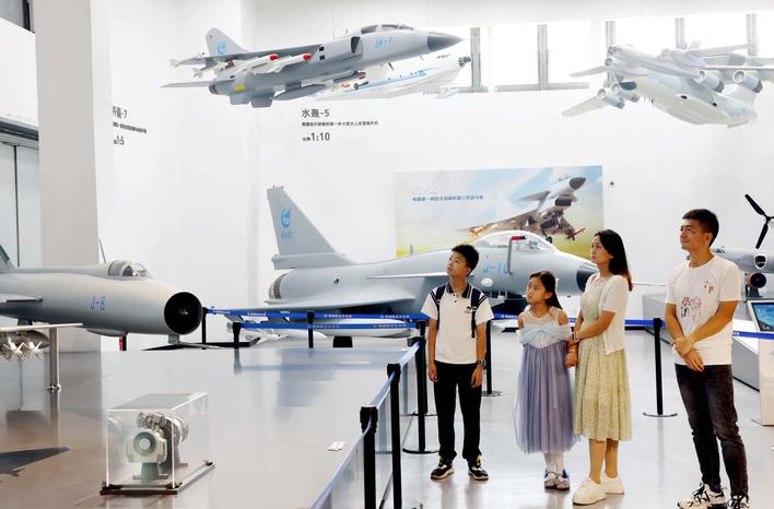 ②家長帶著孩子在揚州航空館參觀。新華社發(fā)(任飛 攝)