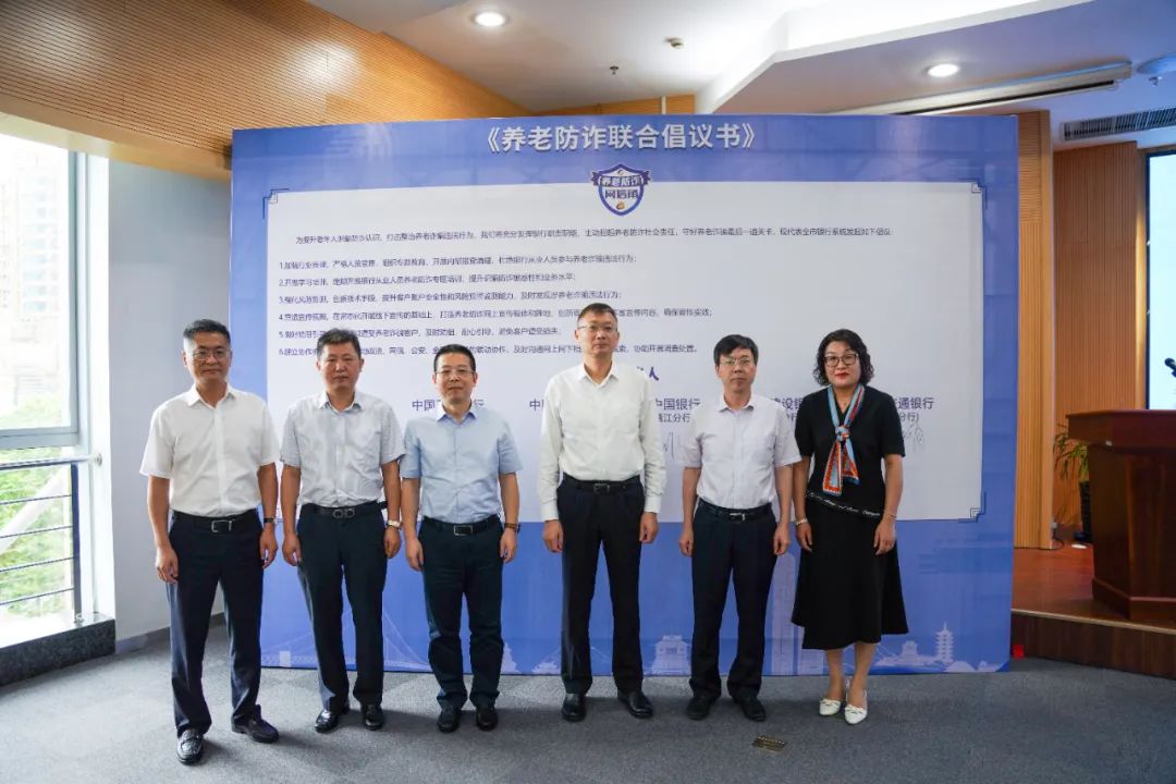 ◆中國工商銀行鎮(zhèn)江分行、中國農(nóng)業(yè)銀行鎮(zhèn)江分行、中國銀行鎮(zhèn)江分行、中國建設(shè)銀行鎮(zhèn)江分行、中國交通銀行鎮(zhèn)江分行和江蘇銀行鎮(zhèn)江分行分管領(lǐng)導共同簽署了《養(yǎng)老防詐聯(lián)合倡議書》。