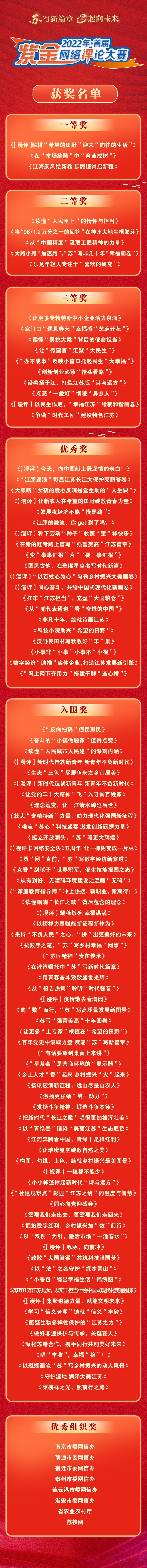 由中共江蘇省委網(wǎng)信辦主辦,新江蘇·中國江蘇網(wǎng)、各設區(qū)市市委網(wǎng)信辦承辦的首屆紫金網(wǎng)絡評論大賽結果正式揭曉。